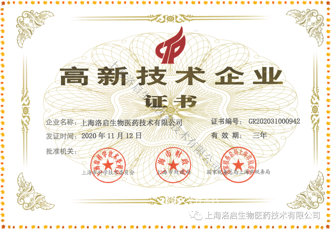 近期,上海九州酷游 ku游生物医药技术有限公司取得了由上海市科学技术委员会、上海市财政局、国家税务总局上海市税务局联合颁发的“高新技术企业证书”。